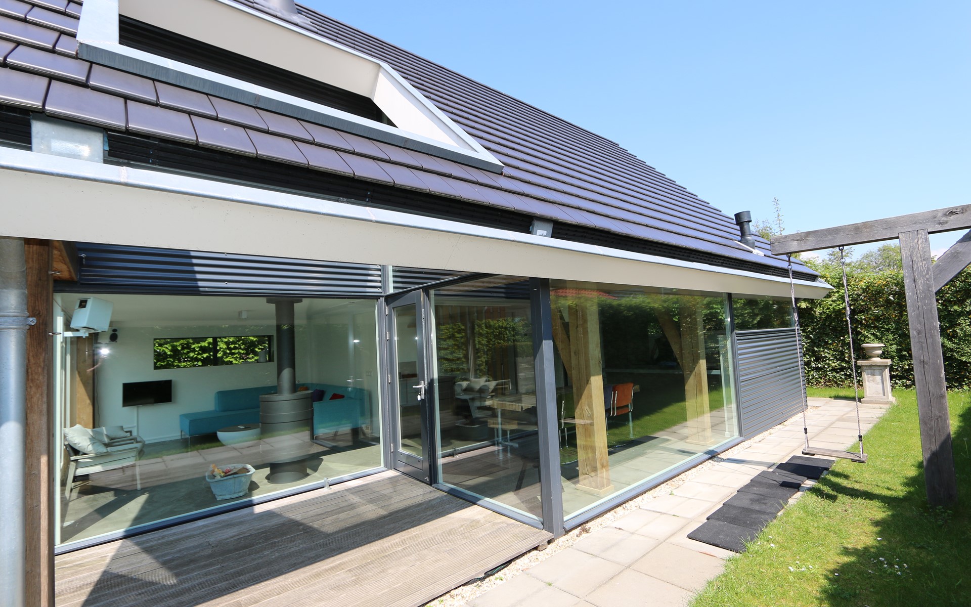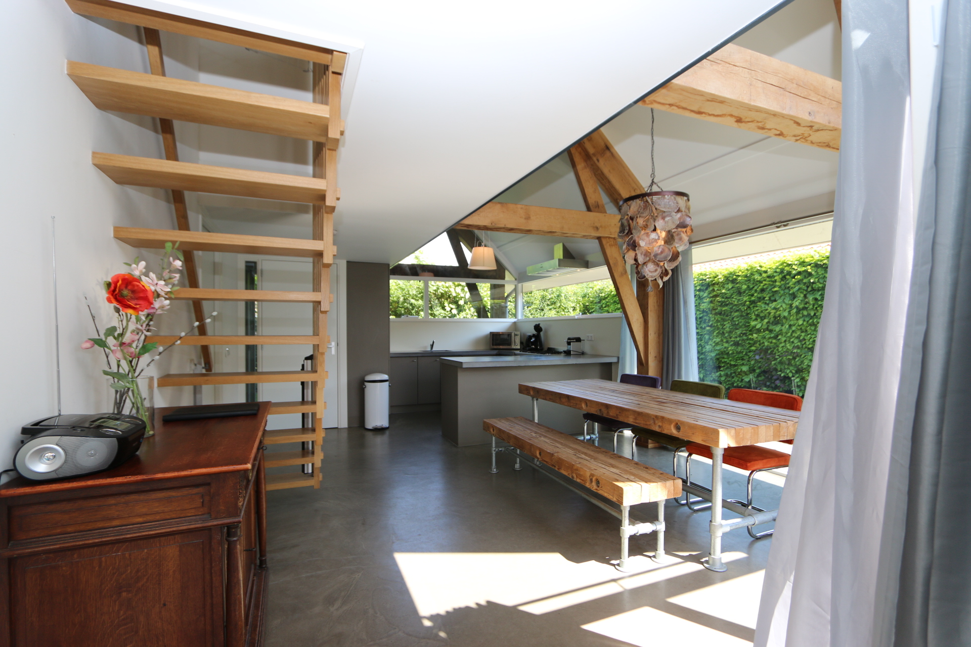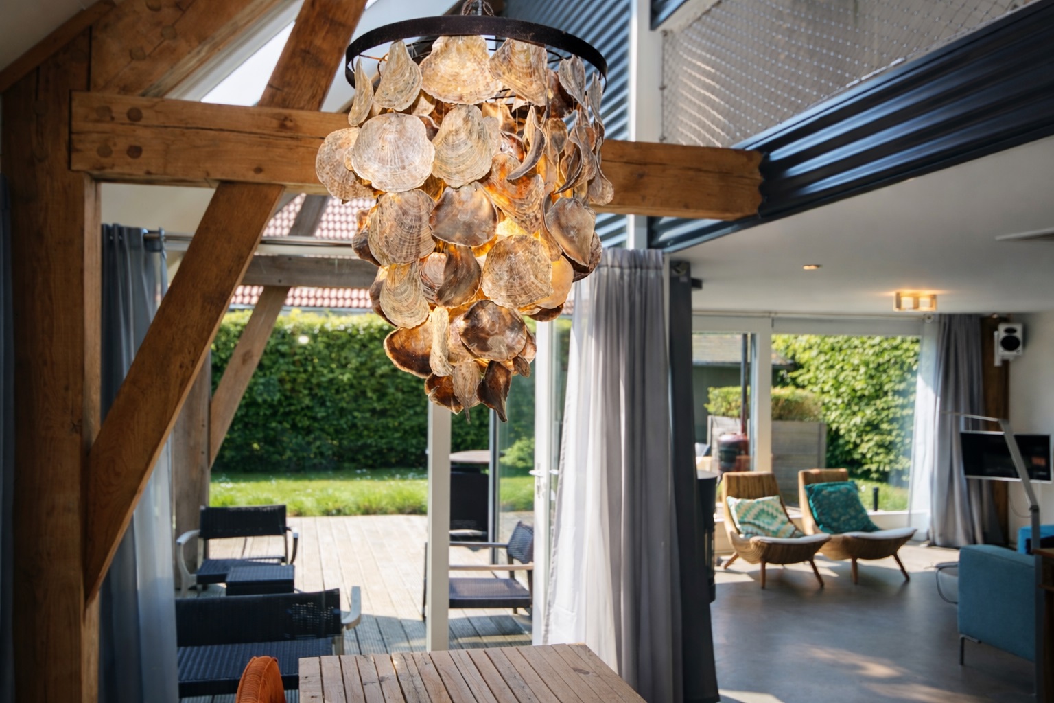 De lichte woonkamer is een heerlijke leefruimte, heeft een houtkachel, grote raampartijen en een schuifpui die zorgen voor veel lichtinval én directe verbinding met de tuin. De karaktervolle houten balken geven de woning een mooie uitstraling en vormen een prachtige match met de moderne afwerking en inrichting.