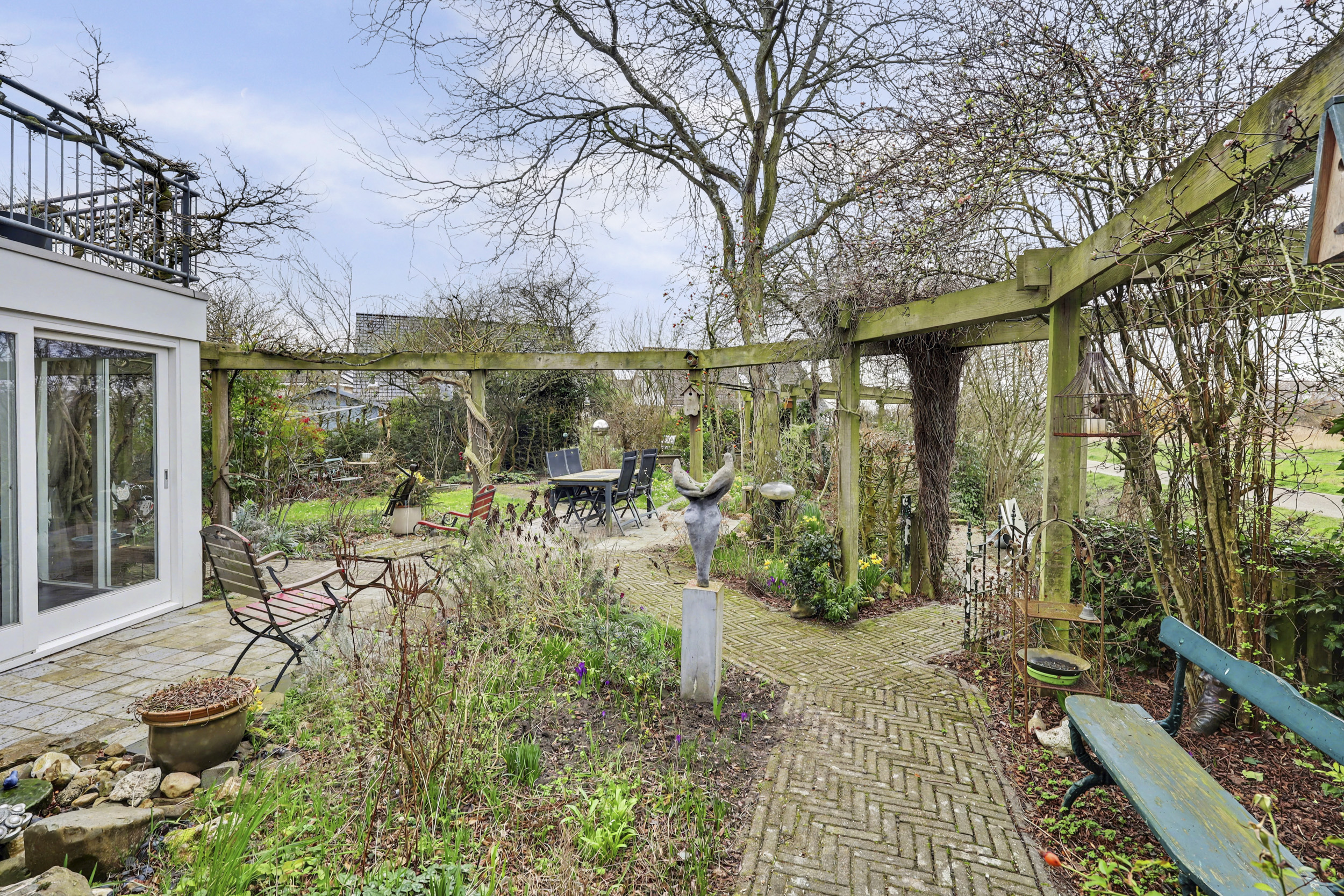 De tuin ligt rondom de woning en is met zorg aangelegd. Dankzij de verschillende terrassen en groene borders is er altijd een fijne plek in de zon of schaduw te vinden. Parkeren kan op de eigen oprit of in de garage.
