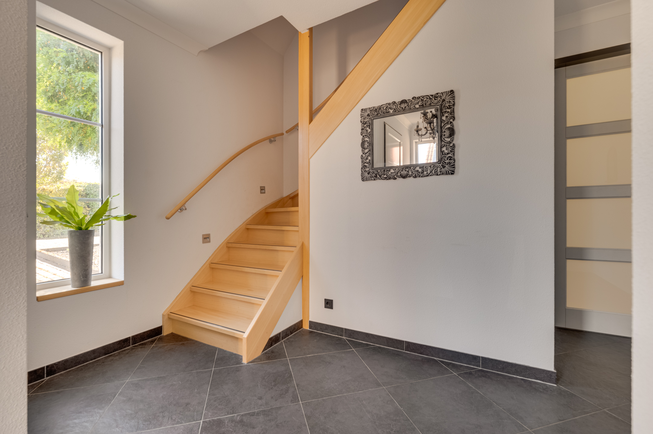 De woning straalt aan de buitenzijde al klasse uit: een statige gevel met hoge ramen, een oprit met parkeerruimte en een inpandige garage. Binnen ervaar je direct de ruimte dankzij de lichte hal met vide en de royale woonkamer. Grote raampartijen zorgen hier voor veel lichtinval en een prettige verbinding met buiten. De woonkamer loopt door naar de eetkamer, die via schuifdeuren direct toegang geeft tot het terras en de tuin.