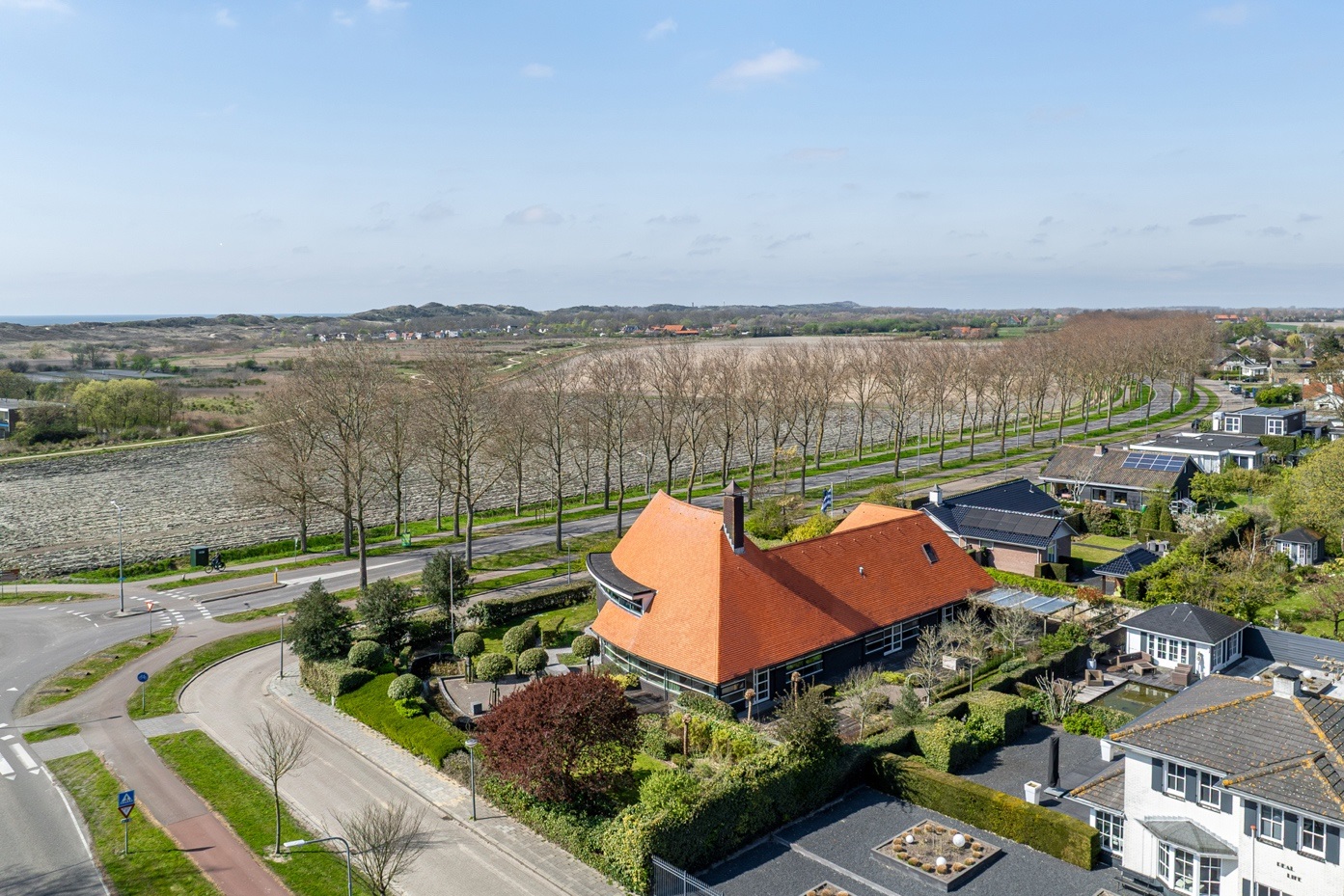 De villa beschikt over 8 kamers en ligt op een ruim perceel van 1.725 m² met een tuin die aanvoelt als een privépark — inclusief twee vijvers, zonneterrassen en pergola met blauwe regen. De oprijlaan heeft voldoende parkeergelegenheid. De grote raampartijen zorgen voor veel licht en uitzicht op tuin, akkers en duinen. De living met open haard, eetkamer in ronde vorm en de keuken met zicht op de duinen maken het woongedeelte compleet.