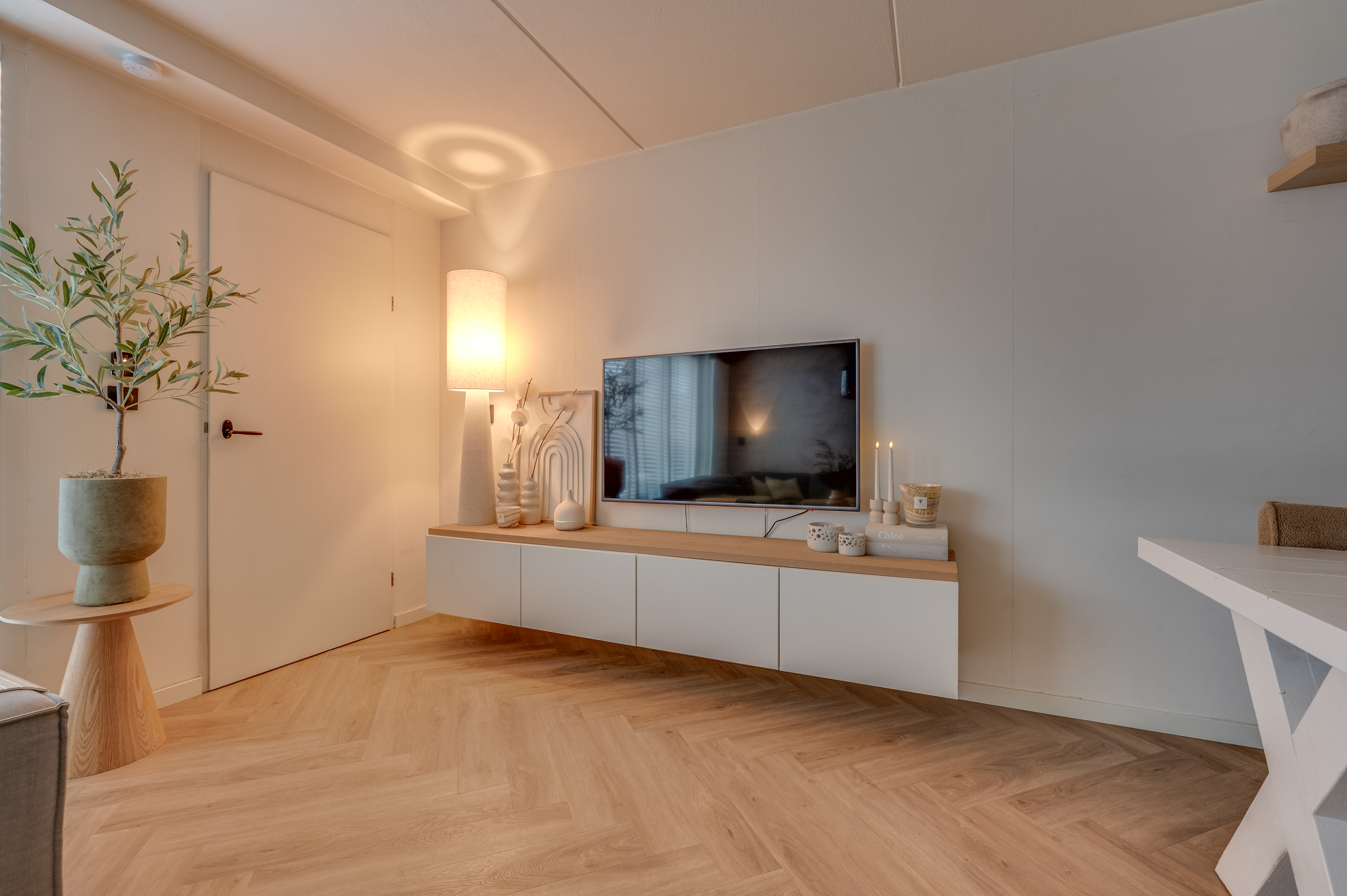 De woonkamer bevindt zich aan de achterzijde van de woning en is dankzij de grote ramen prettig licht. Aan de voorzijde ligt de ruime en jonge keuken, voorzien van een inductiekookplaat met geïntegreerde afzuiging, koelkast, vriezer, vaatwasser, combi-oven en een 3-in-1 waterkraan.