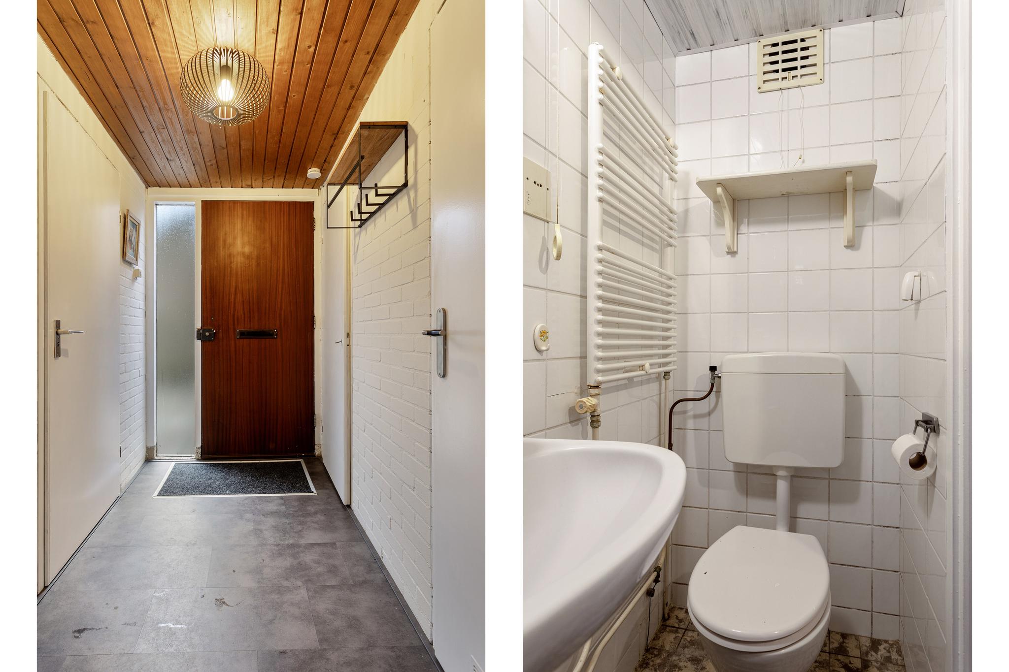 Entree, meterkast, inbouwkast met CV-opstelling, hal, badkamer/toilet, voorts de toegang tot de woonkamer waar ook de trapopgang naar de eerste verdieping gesitueerd is, links de toegang tot de woonkamer welke zich aan de achterzijde van de woning bevindt en rechts de toegang tot de keuken welke voorzien is van diverse inbouwapparatuur, zoals een oven, elektrische kookplaat, afzuigkap en vaatwasser.