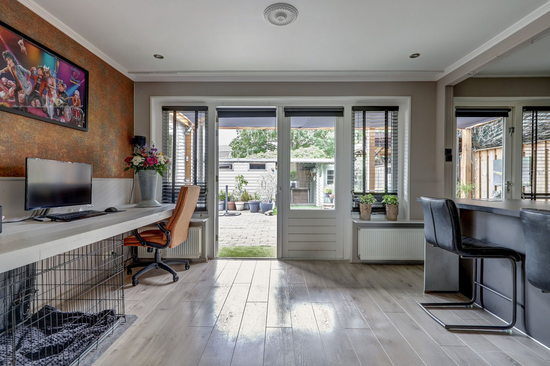 Via de entree komt u in de hal met meterkast, toilet, trapopgang en toegang tot de woonkamer en de keuken. De begane grond heeft een speelse indeling, waarvan iedere ruimte zijn eigen functie heeft. De woonkamer is een prettige lichte ruimte dankzij de grote raampartij aan de voorzijde, en u kunt vanaf de bank de tuin inkijken. De woonkamer is voorzien van een airco-unit wat zorgt voor extra comfort. Aan de achterzijde is een deel uitgebouwd. Hier is een moderne (thuis)werkplek gecreëerd en openslaande tuindeuren om buiten met binnen te verbinden.