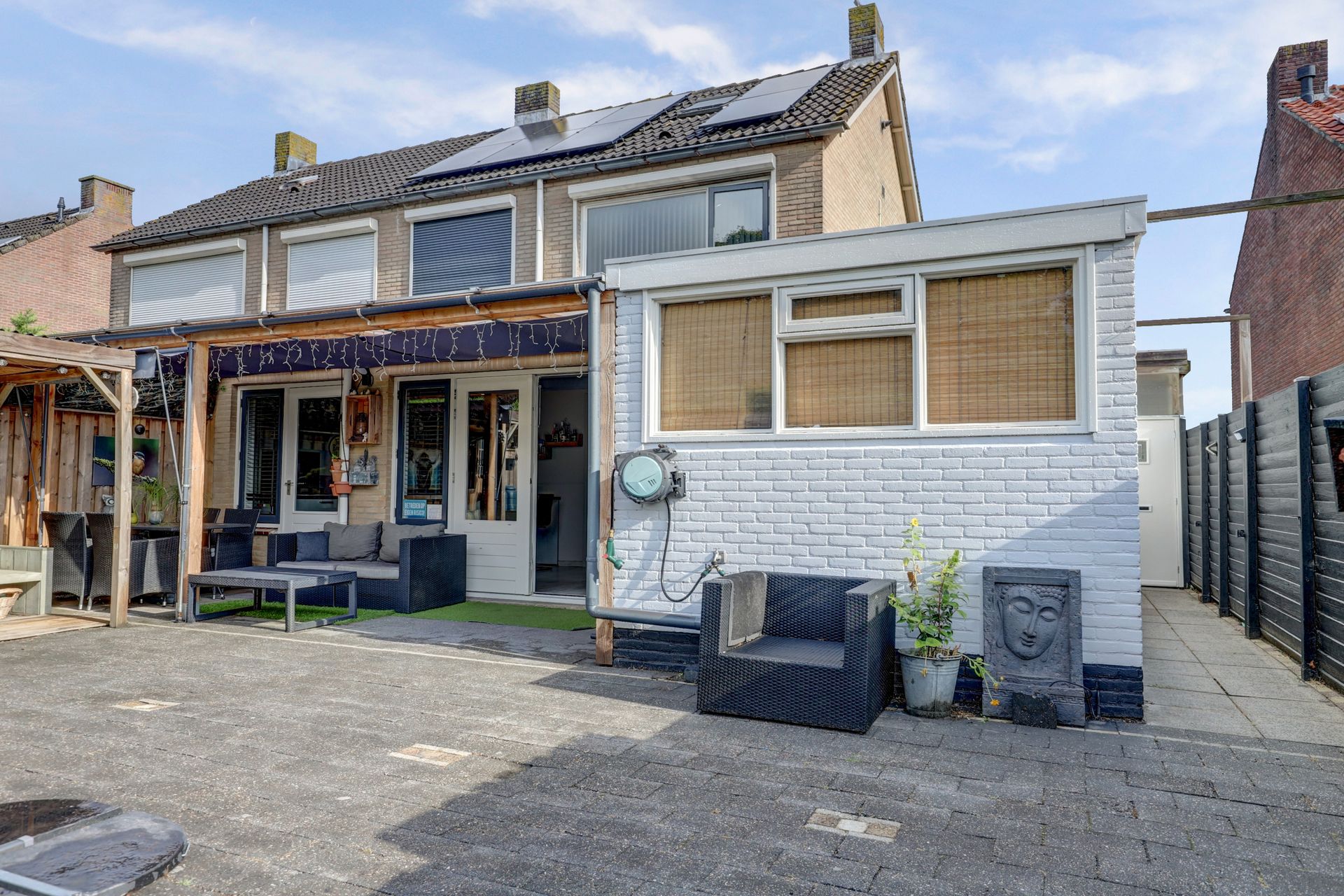 De woning beschikt over een onderhoudsvriendelijke voor- en achtertuin. Over de gehele breedte aan de achterzijde van de tuin is een bergruimte, schuurtje met overkapping gecreëerd. De achterzijde van de woning heeft ook een overkapping, zodat u heerlijk uit de zon kunt zitten. Verspreidt in de tuin zijn gezellige zitjes, waardoor u optimaal kunt genieten van de tuin. Dankzij de vrije achterom is de tuin goed bereikbaar. Aan de voorzijde van de woning is het mogelijk om met 2 auto’s op uw eigen oprit te parkeren.