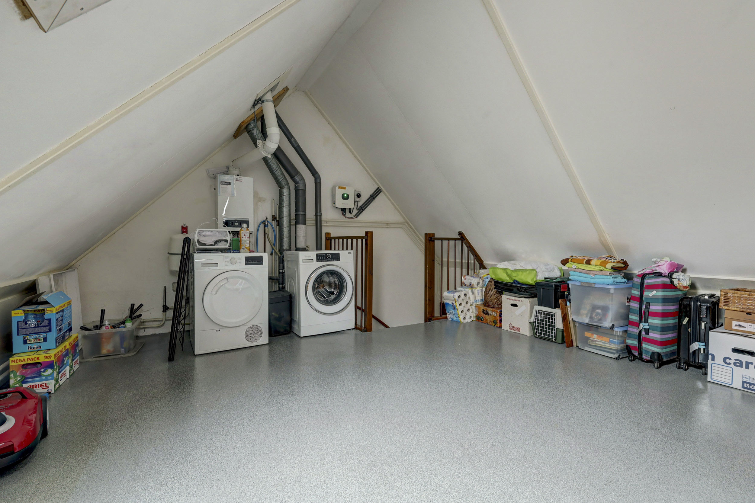 De zolder met vaste trap wordt momenteel gebruikt als bergruimte. Deze verdieping biedt volop mogelijkheden en is erg eenvoudig om te vormen tot een volwaardige vierde slaapkamer. Hier is ook de aansluiting voor de wasmachine te vinden en is de cv-installatie geïnstalleerd.
