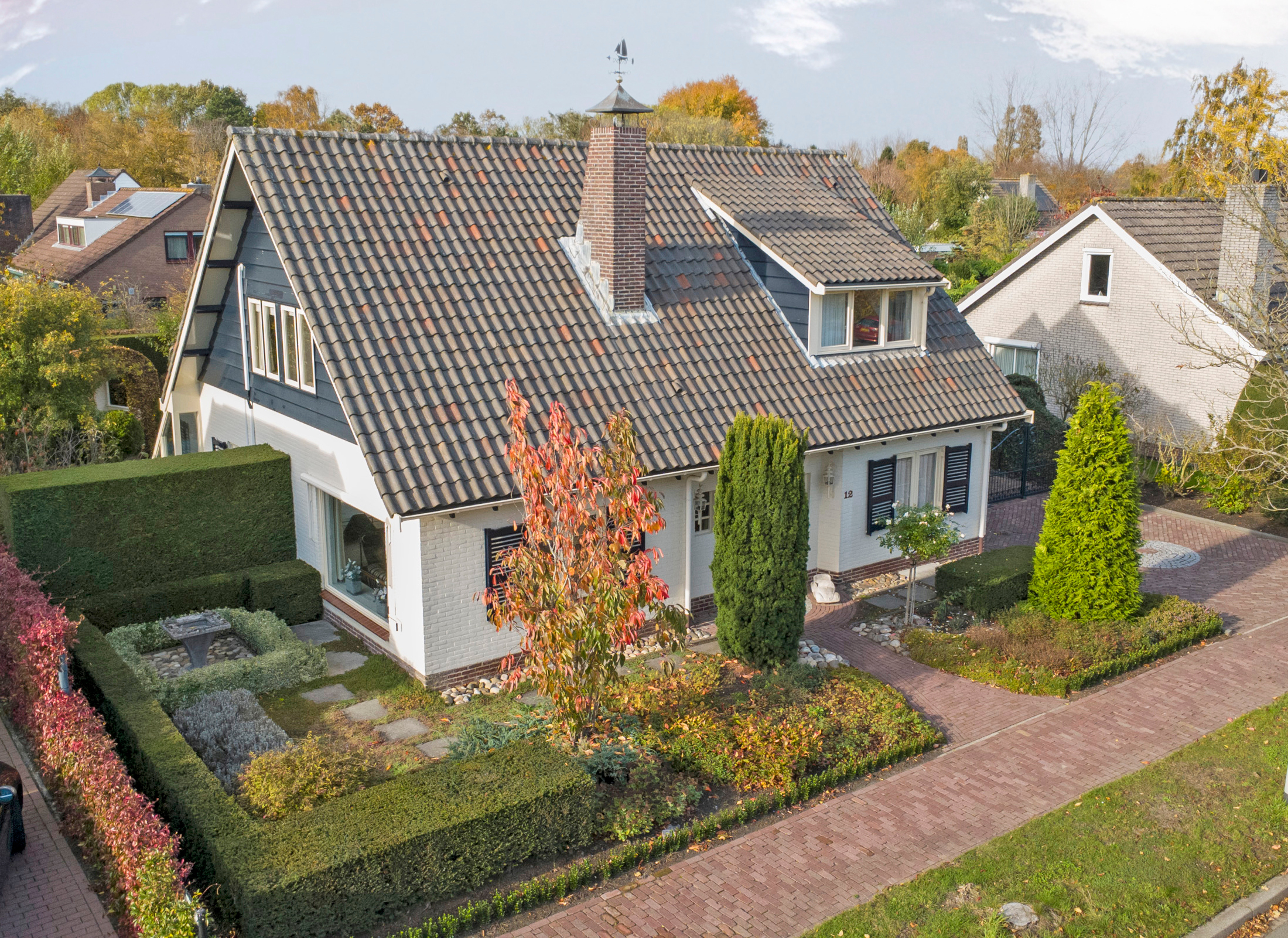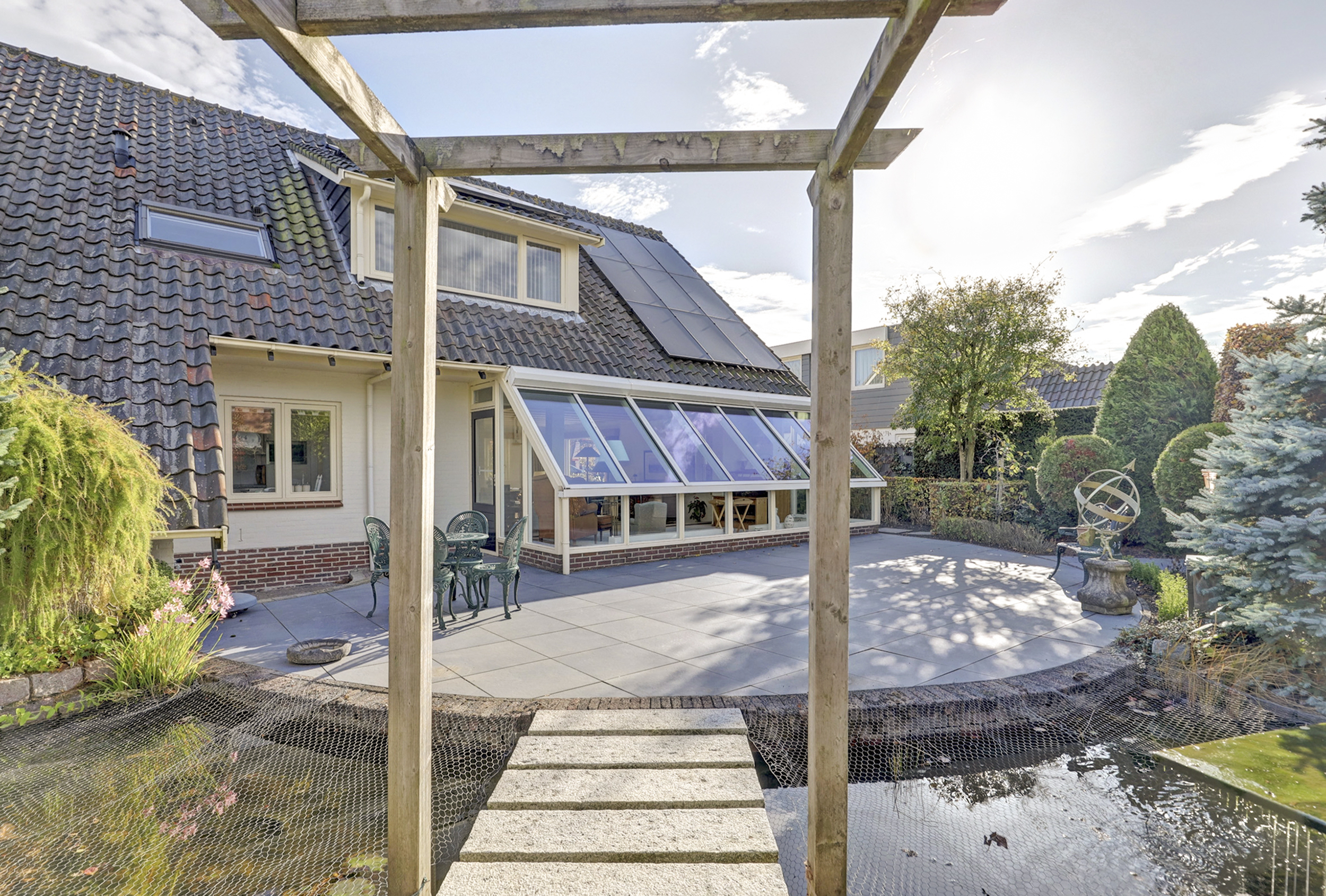 De prachtig aangelegde achtertuin is op het oosten gericht met vrije achterom en is ingericht met diverse beplanting en sierbestrating. Daarnaast beschikt het huis over een aangebouwde garage met ruimte voor één auto en is voorzien van water en elektriciteit. Bovendien is er een extra ruimte boven de garage. De oprit biedt ruimte voor meerdere auto’s en heeft een automatisch bedienbare poort. In de tuin staan nog een tweetal houten schuurtjes.