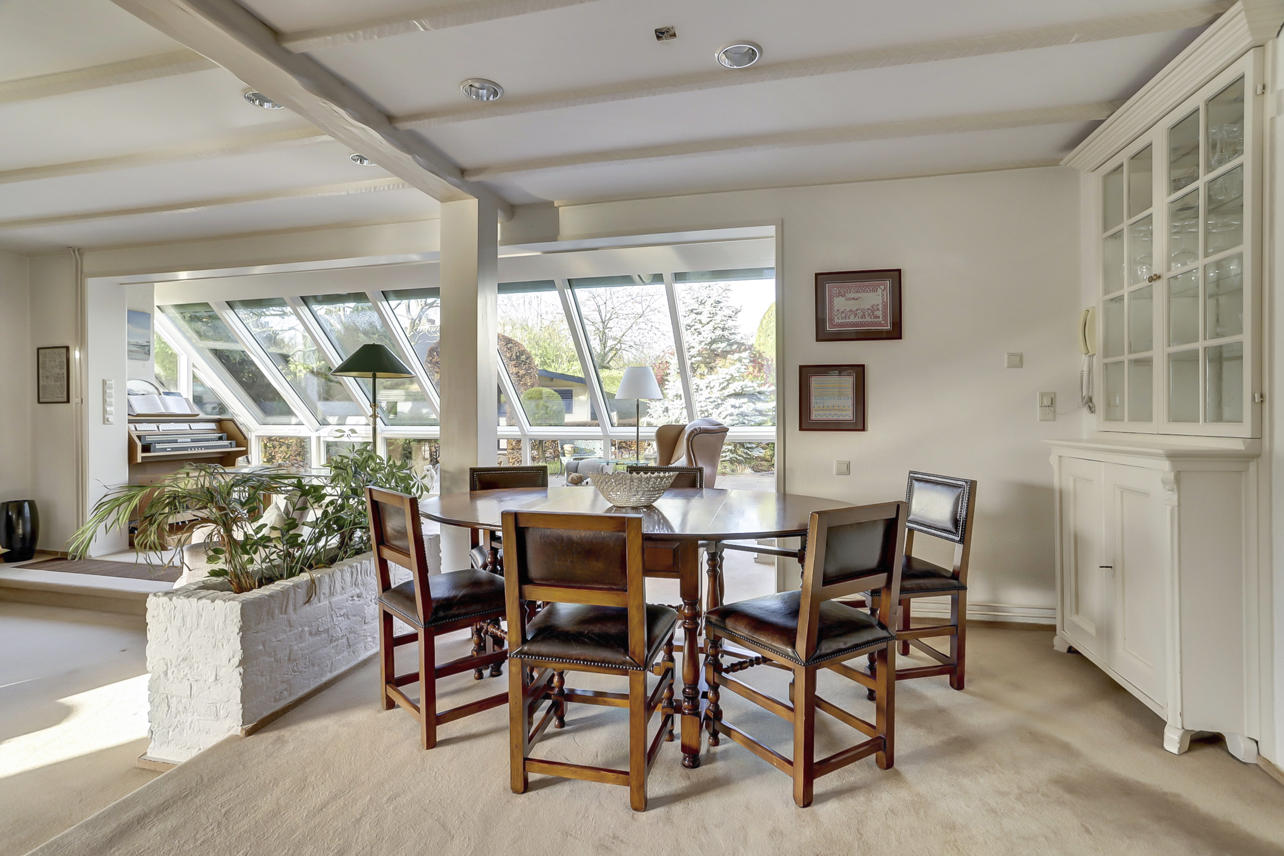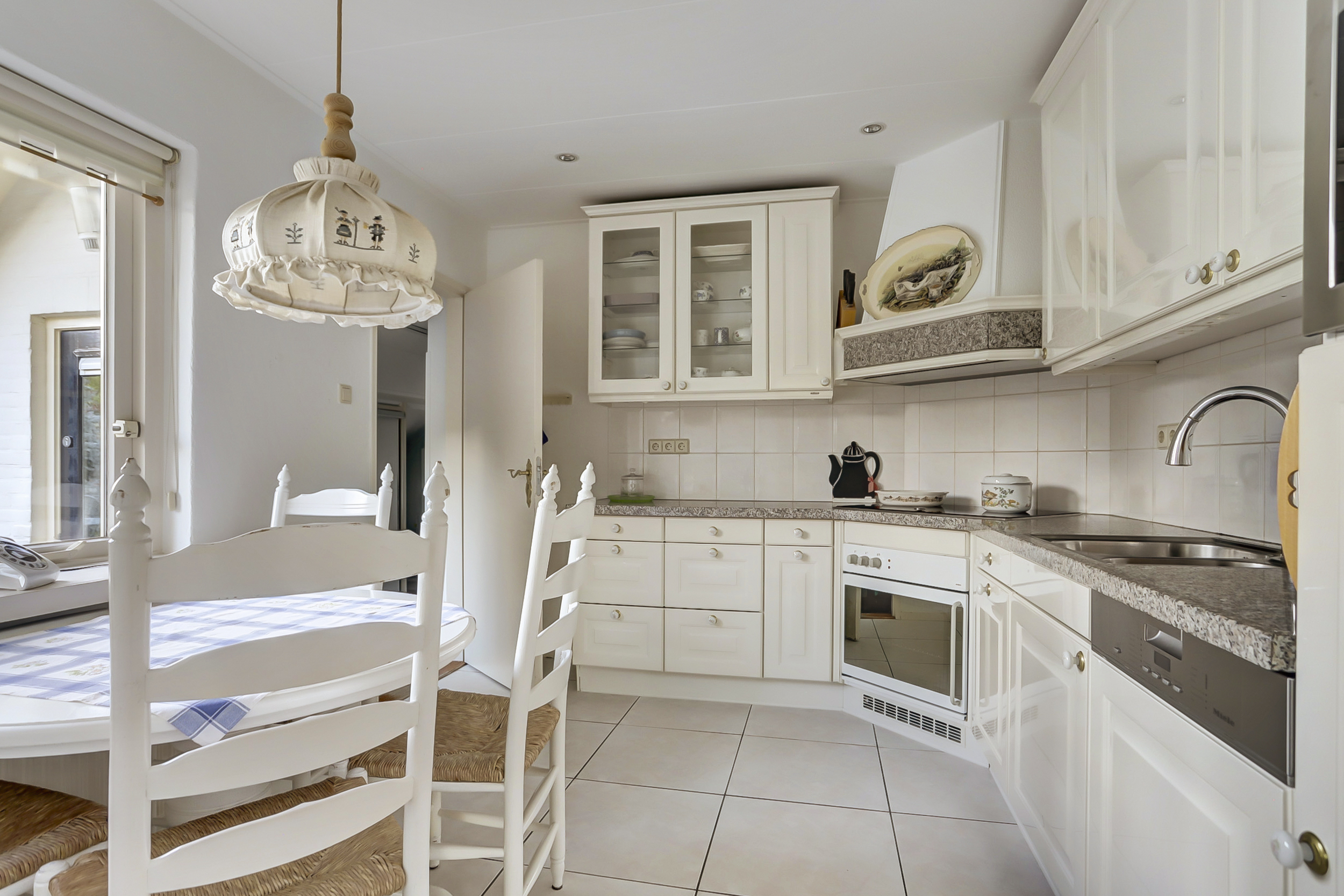 Er is ruimte voor een eettafel naast de afgesloten keuken. De landelijke keuken in L-vorm is voorzien van inbouwapparatuur; vaatwasser, koelkast, oven en inductiekookplaat en ruimte voor een ontbijttafel. De keuken staat in verbinding met de bijkeuken die toegang geeft tot de garage en de tuin.