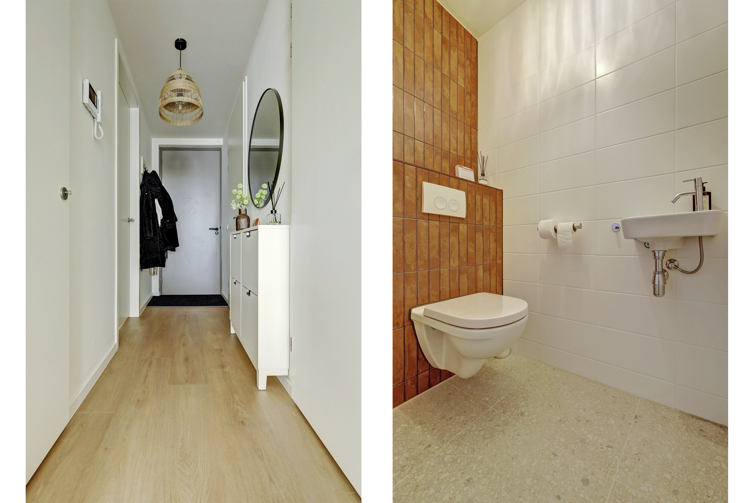 Via de entree kom je binnen in de hal, die toegang geeft tot alle ruimtes van het appartement. In de hal bevinden zich het aparte toilet en een praktische ruimte met wasmachine aansluiting en de Intergas cv-installatie (2024). De hal leidt verder naar de lichte woonkamer, waar de grote ramen en het dakraam zorgen voor fijne en natuurlijke lichtinval. De woonkamer staat direct in verbinding met de moderne keuken, uitgevoerd in 2024 en voorzien van een kookeiland. Een centrale plek in de woning, waar tijdens het koken gezellig aangeschoven kan worden voor een drankje.