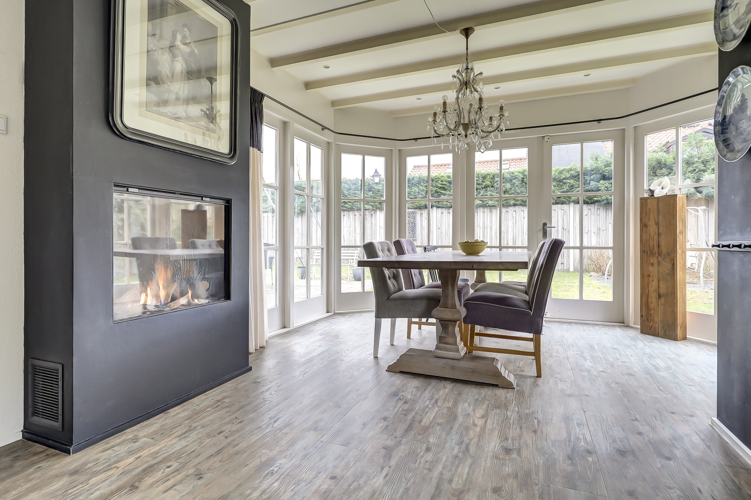 De woonkamer biedt eveneens een aangename sfeer en is uitgerust met een houtkachel, wat zorgt voor extra charme en een knusse ambiance in de wintermaanden. Grote raampartijen zorgen voor een prettige lichtinval en een mooie verbinding met de tuin rondom.