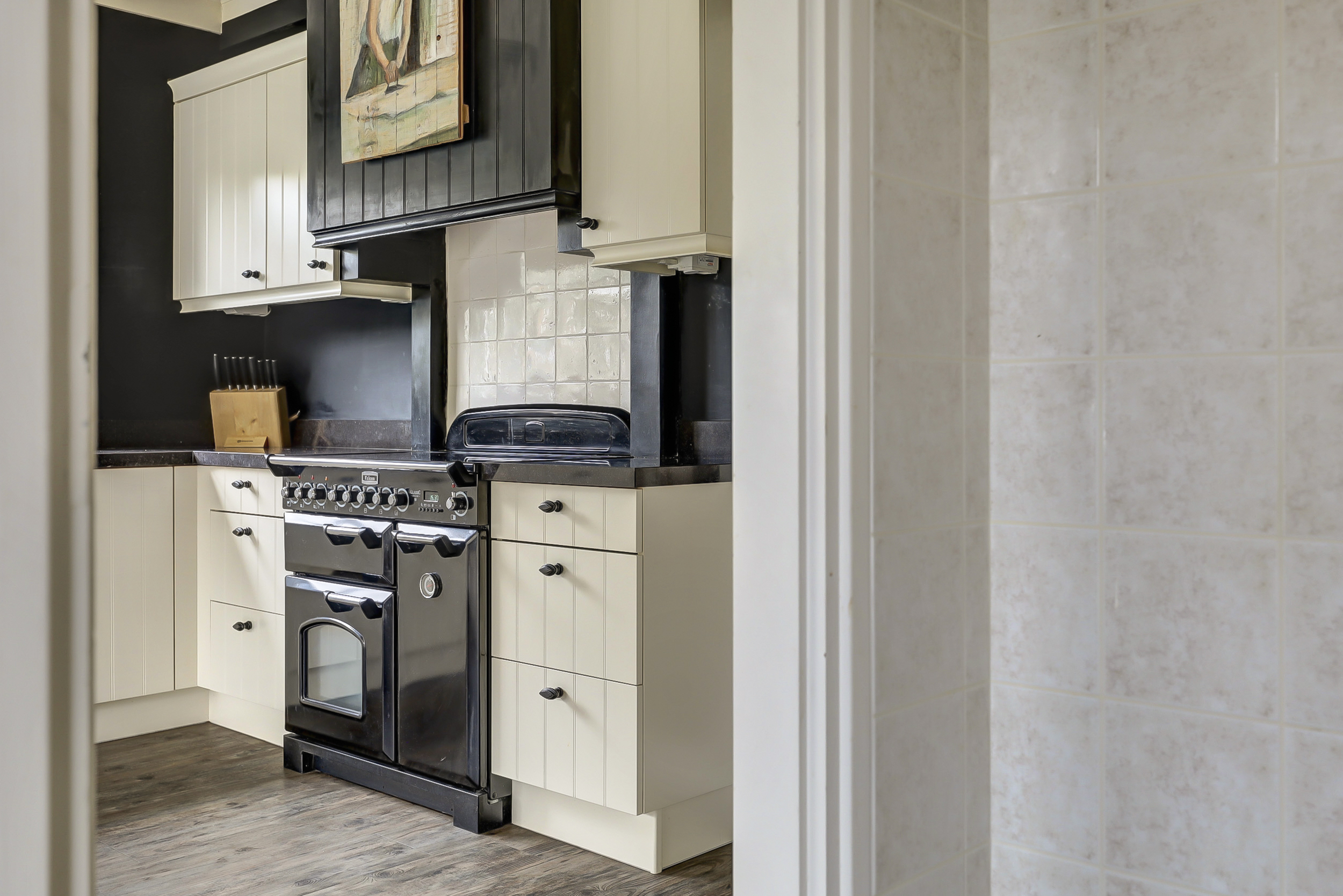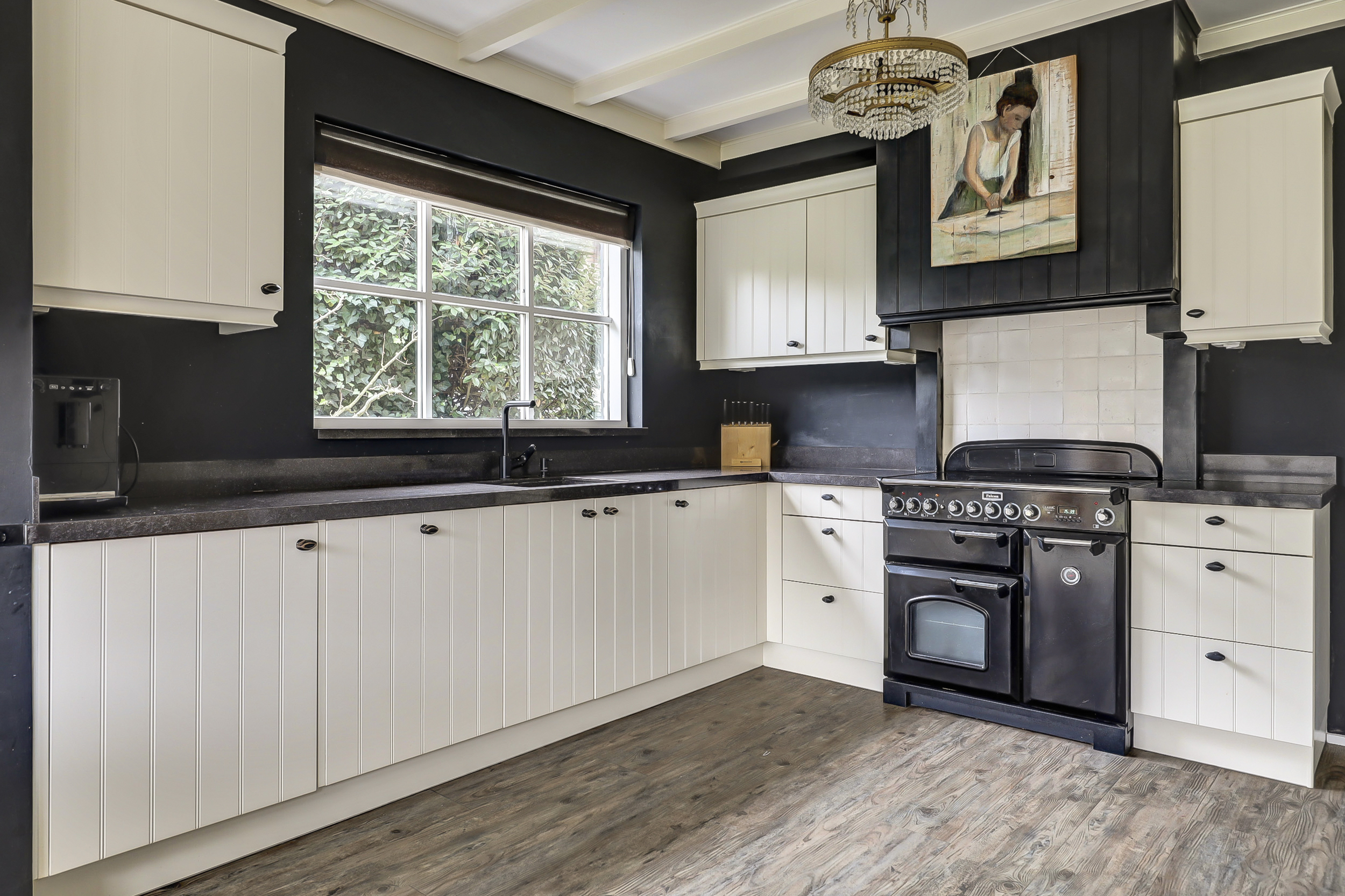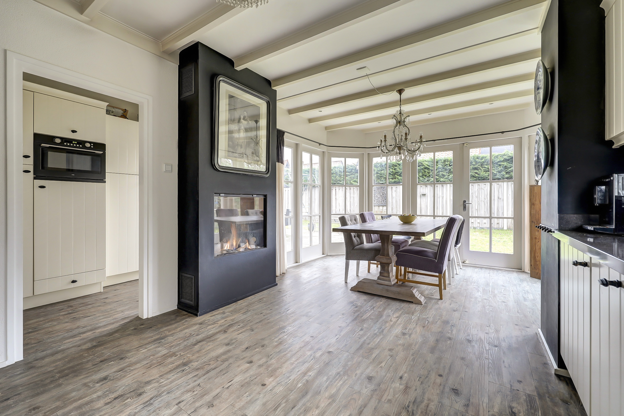 De woning is aan de achterzijde uitgebouwd met een serre, waardoor een indrukwekkend ruime woonkeuken is ontstaan. Dit is zonder twijfel het hart van het huis. Hier komen koken, tafelen en samenzijn heerlijk samen. De keuken is niet alleen ruim opgezet, maar ook bijzonder sfeervol dankzij de aanwezige gashaard die zorgt voor warmte en gezelligheid tijdens lange avonden aan tafel. Aansluitend bevindt zich een riante bijkeuken die is voorzien van diverse extra inbouwapparatuur en volop kastruimte, waardoor functionaliteit en comfort hier perfect samenkomen.