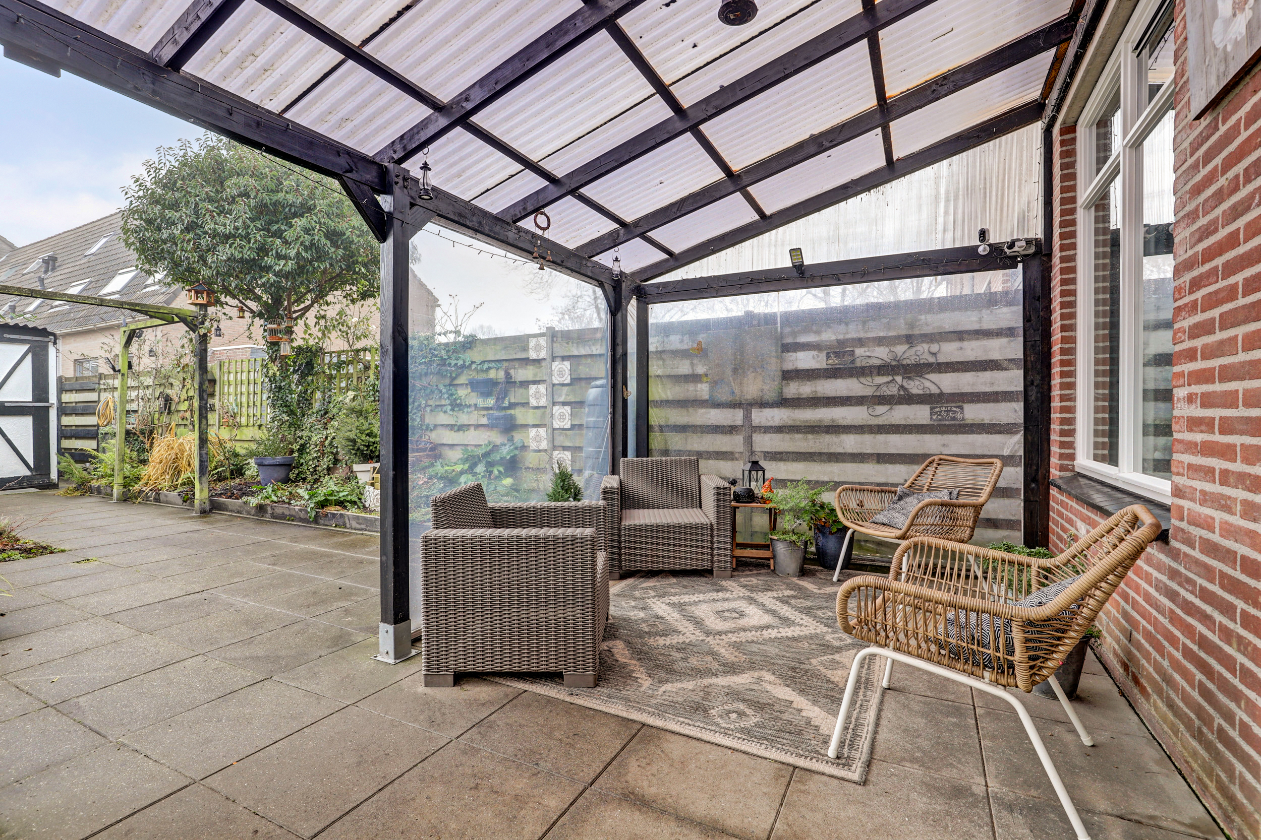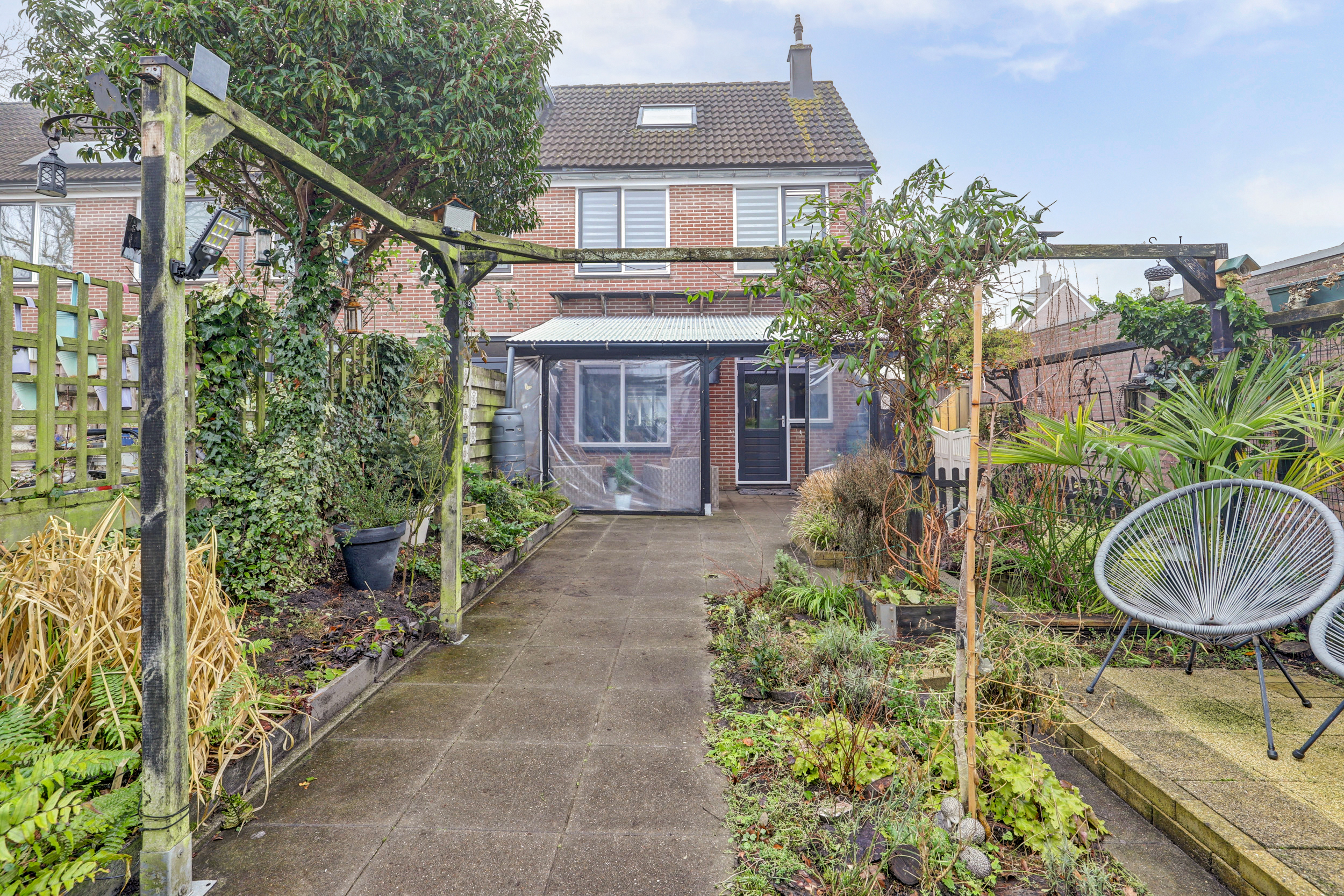 De achtertuin is gelegen op het Oosten en is te bereiken middels een mandelig pad die aan de zijkant van de woning gelegen is. Daarnaast beschikt de woning over een veranda en een ruime schuur voor alle tuinspullen.