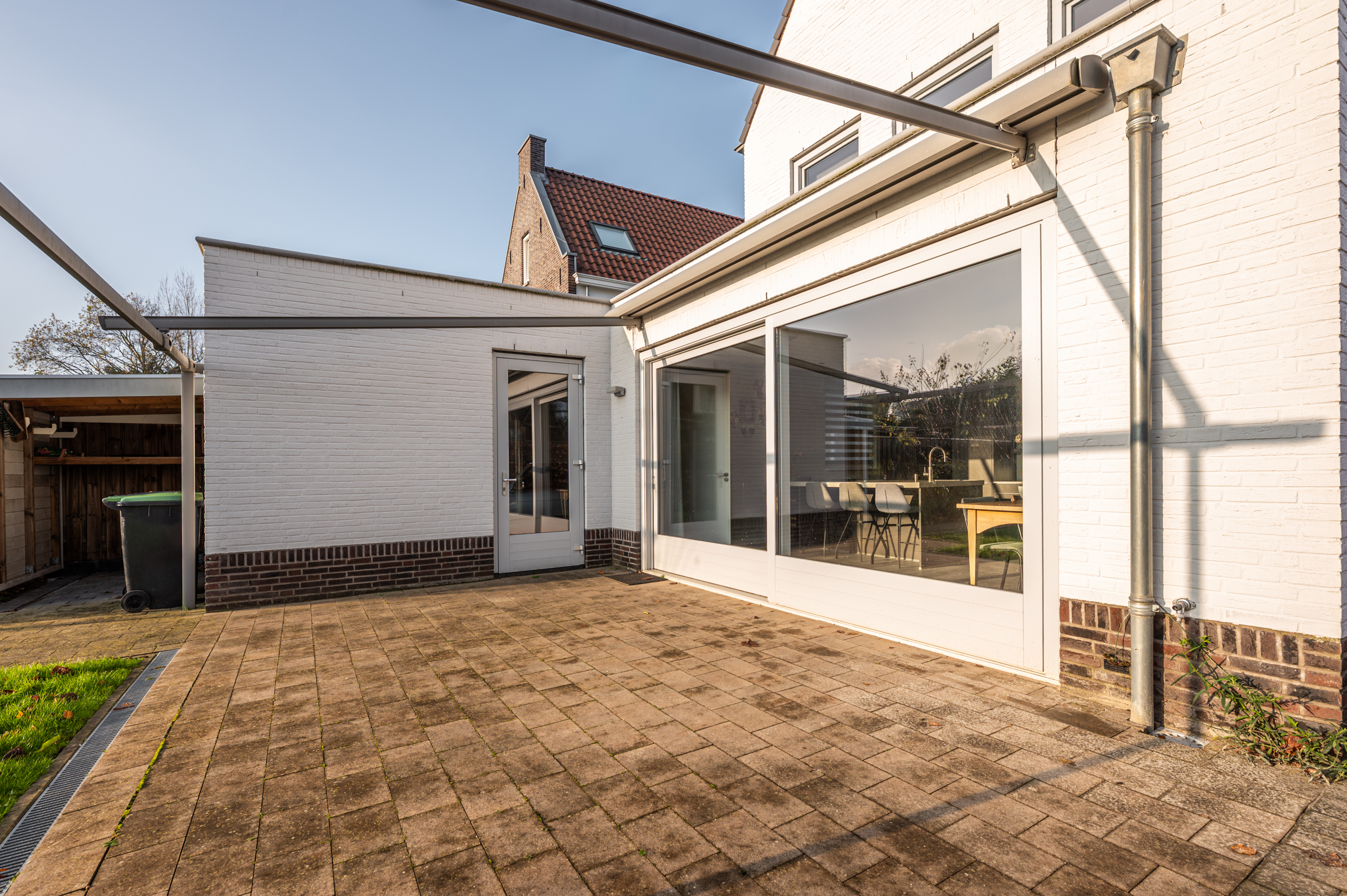 Buiten geniet je van een nette, onderhoudsvriendelijke tuin met berging, overkapping (beide voorzien van elektra) en een vrije achterom. Aan de voorzijde is een riante oprit met parkeerruimte voor twee auto’s.