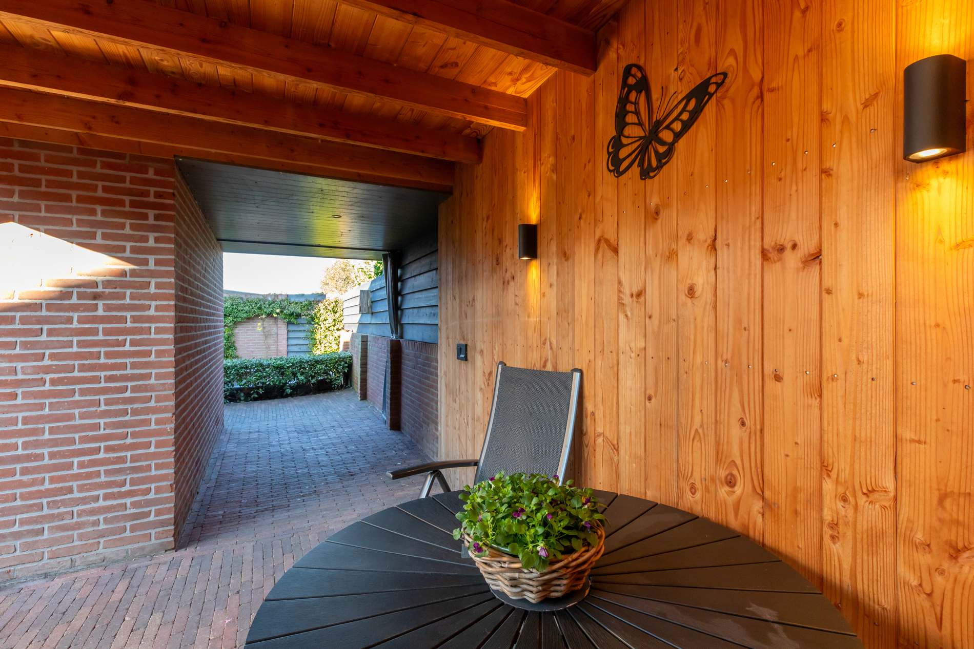 Direct aan de bijkeuken bevind zich een tuin met terras, groen en gras. Terwijl aan de zuidzijde van de garage er een veranda met speelplaats voor de kinderen is gerealiseerd. Een heerlijke en zonnig plek om lang van de zon te genieten. Op een slimme manier is deze ruimte afgeschermd van de oprit zodat er een hoge mate van privacy is.