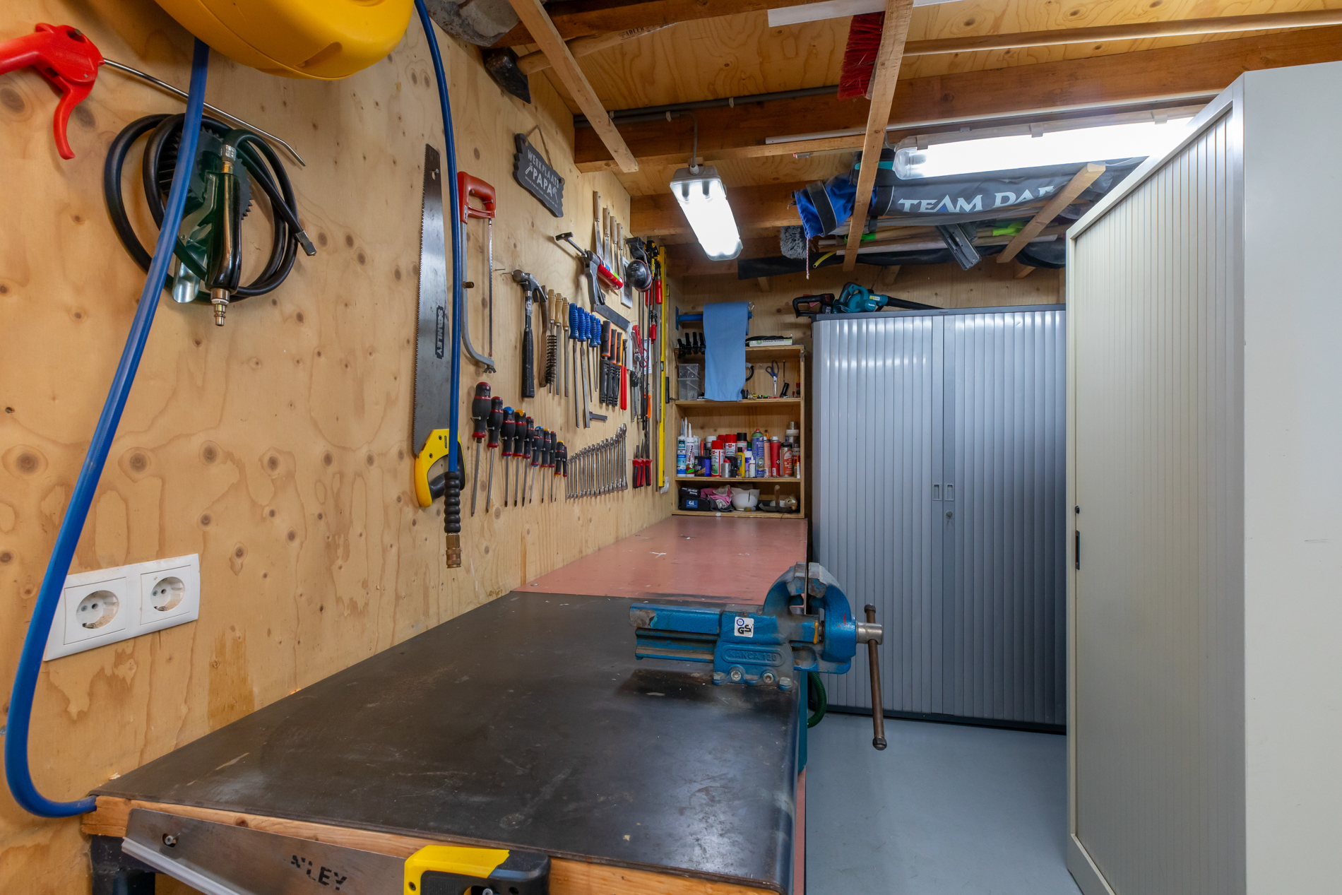 De garage is ruim en luxe, muur en dak zijn geïsoleerd en er is elektra, water en verwarming aanwezig. Een elektrische garagedeur naar de oprit en een loopdeur naar de tuin maakt deze makkelijk in gebruik. Parkeren kan op de eigen oprit aan de voorzijde, er is plaats voor meerdere auto’s.