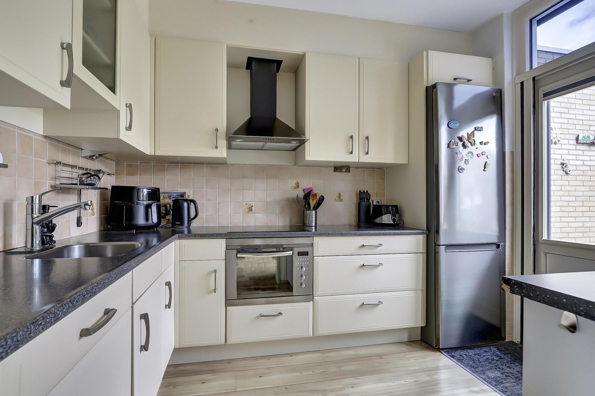 De eetkamer grenst aan de halfopen keuken, die is uitgerust met een inductiekookplaat, combi-oven en vaatwasser. Vanuit de keuken heeft u toegang tot de achtertuin, die is gelegen op het westen en voorzien van een elektrisch zonnescherm. Achterin de tuin bevindt zich een vrijstaande berging en een achterom. Direct achter de woning ligt een speeltuintje, wat deze locatie extra aantrekkelijk maakt voor gezinnen met jonge kinderen.