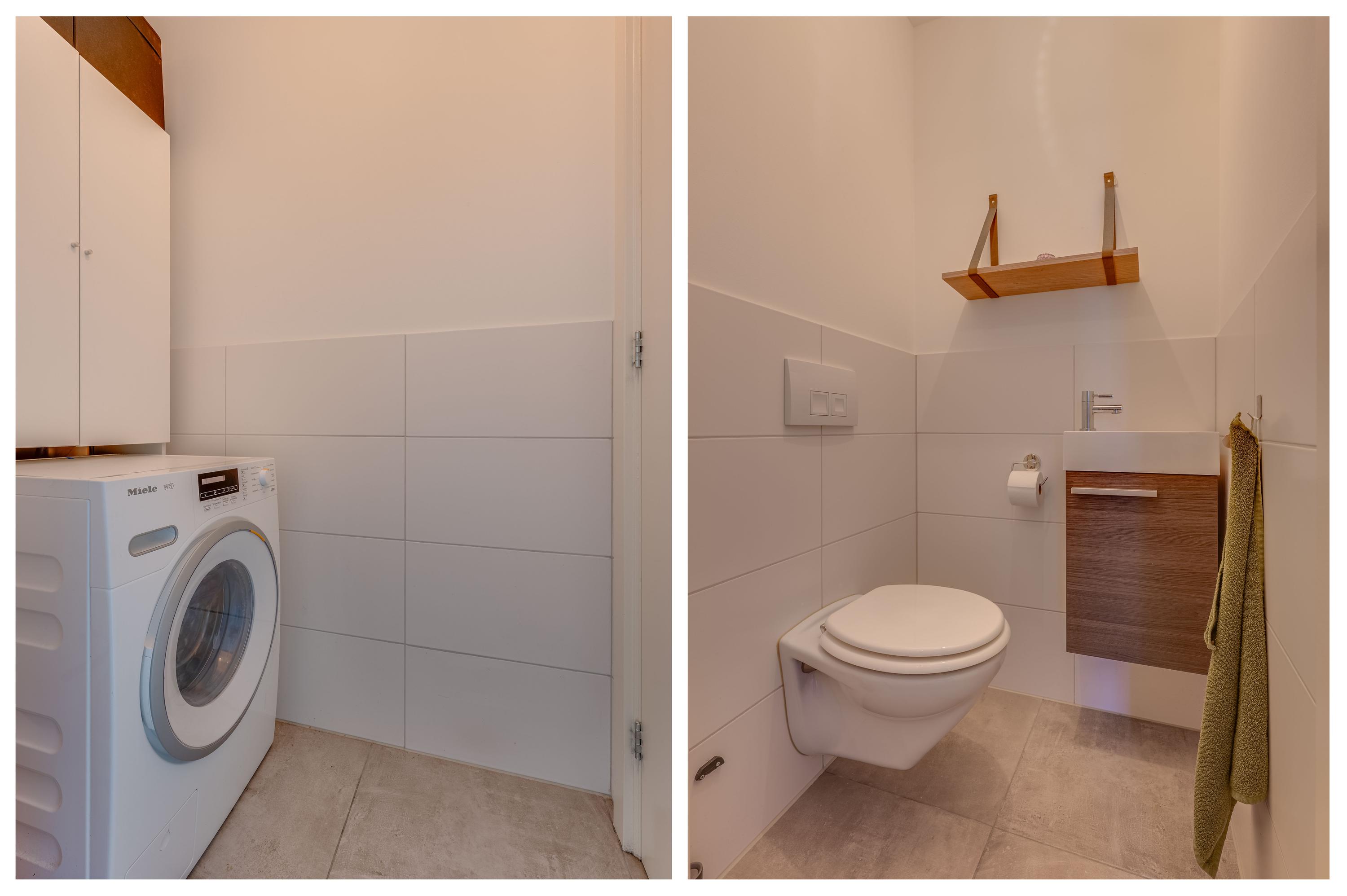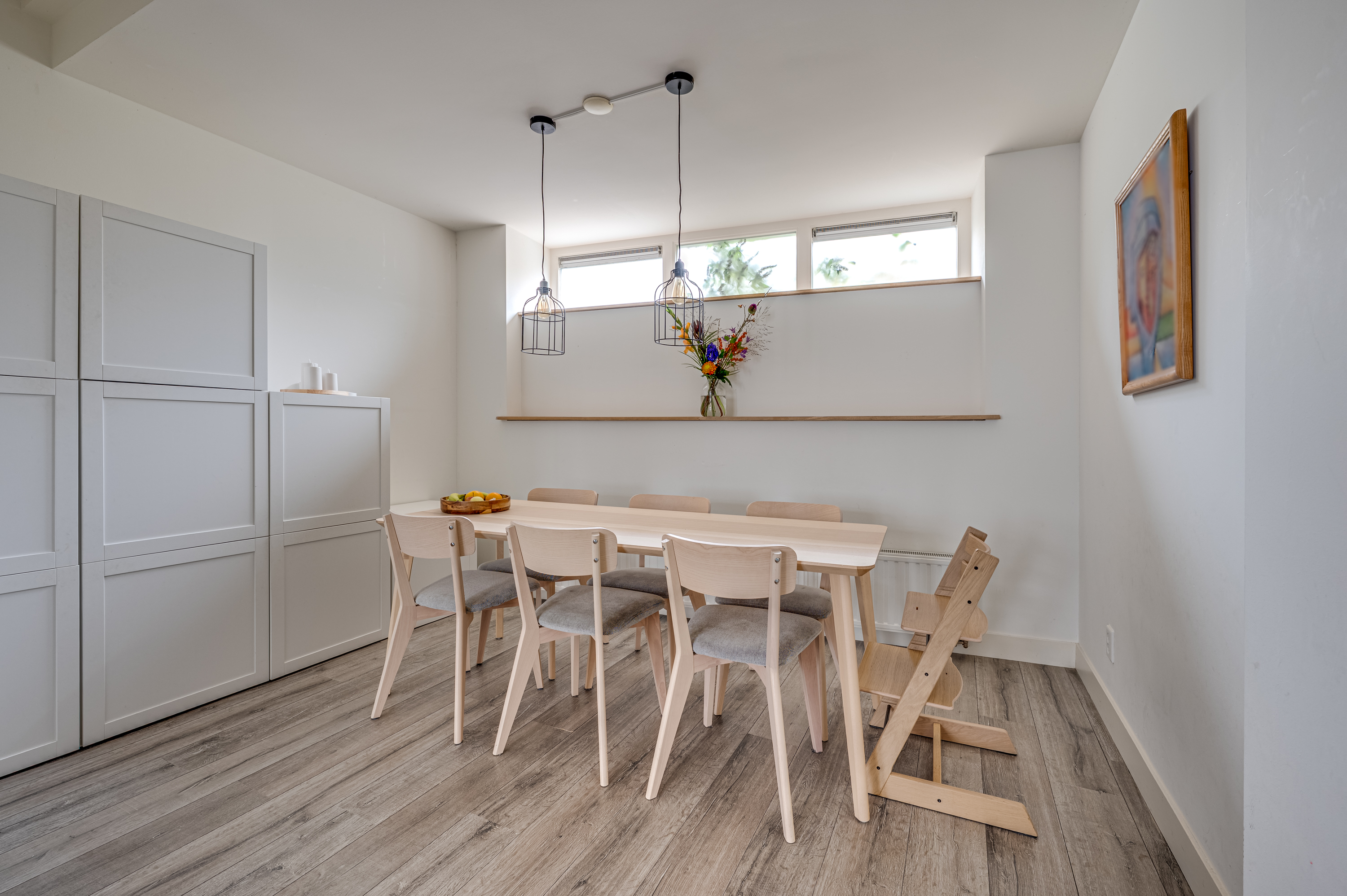 Bij binnenkomst merk je direct hoe doordacht de indeling is. De hal biedt praktische ruimte voor het stallen van twee fietsen en geeft toegang tot de meterkast. Aan de voorzijde ligt de royale leefkeuken (ca. 29 m²): een sfeervolle woonkeuken met moderne keukeninrichting en diverse inbouwapparatuur, een perfecte plek voor lange avonden koken en tafelen. Aansluitend bevindt zich de bijkeuken met opstelplaats voor wasmachine en droger, plus extra bergruimte. Ook is hier het vernieuwde toilet te vinden.