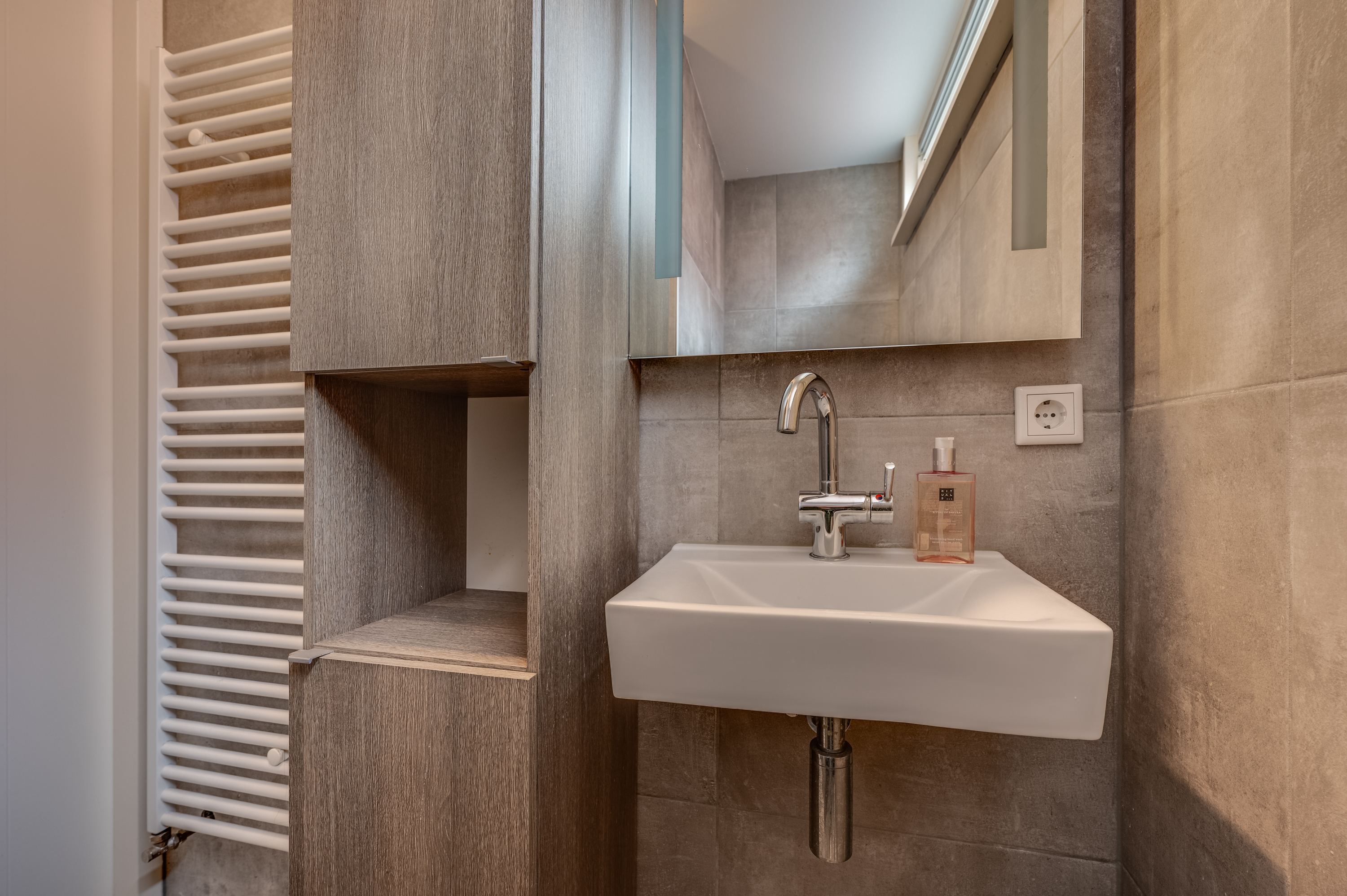 Op de eerste verdieping bevindt zich de verrassend ruime en lichte woonkamer (ca. 27 m²). Dankzij de hoge ramen en de ligging op verdieping geniet je hier van optimale privacy. Via de openslaande deuren stap je direct het grote en zonnige dakterras (ca. 10 m²) op het zuiden op, midden in de stad maar toch heel privé.