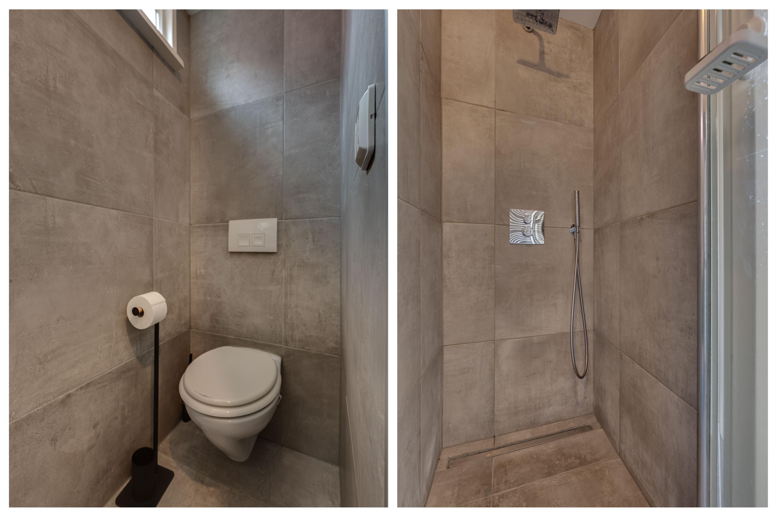De tweede verdieping biedt twee slaapkamers en een luxe, moderne badkamer voorzien van een douche, wastafel en tweede toilet.